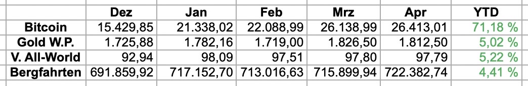 Die wichtigste Veränderung im April war die Auszahlung den Margin Kredit von rd. -12 TEUR. Dafür wurde Novartis verkauft und der Vanguard All-World reduziert. Erhöht wurde 3M, eine Startposition für WestRock und 1 TEUR in Bitcoin. Die geplanten Sparpläne (Vanguard All-World, Bausparen, Gold & Bitcoin) wurden durchgeführt und seit 2023 kamen die Sparpläne für US $ TIPS und EQQQ Nasdaq 100 dazu 😇