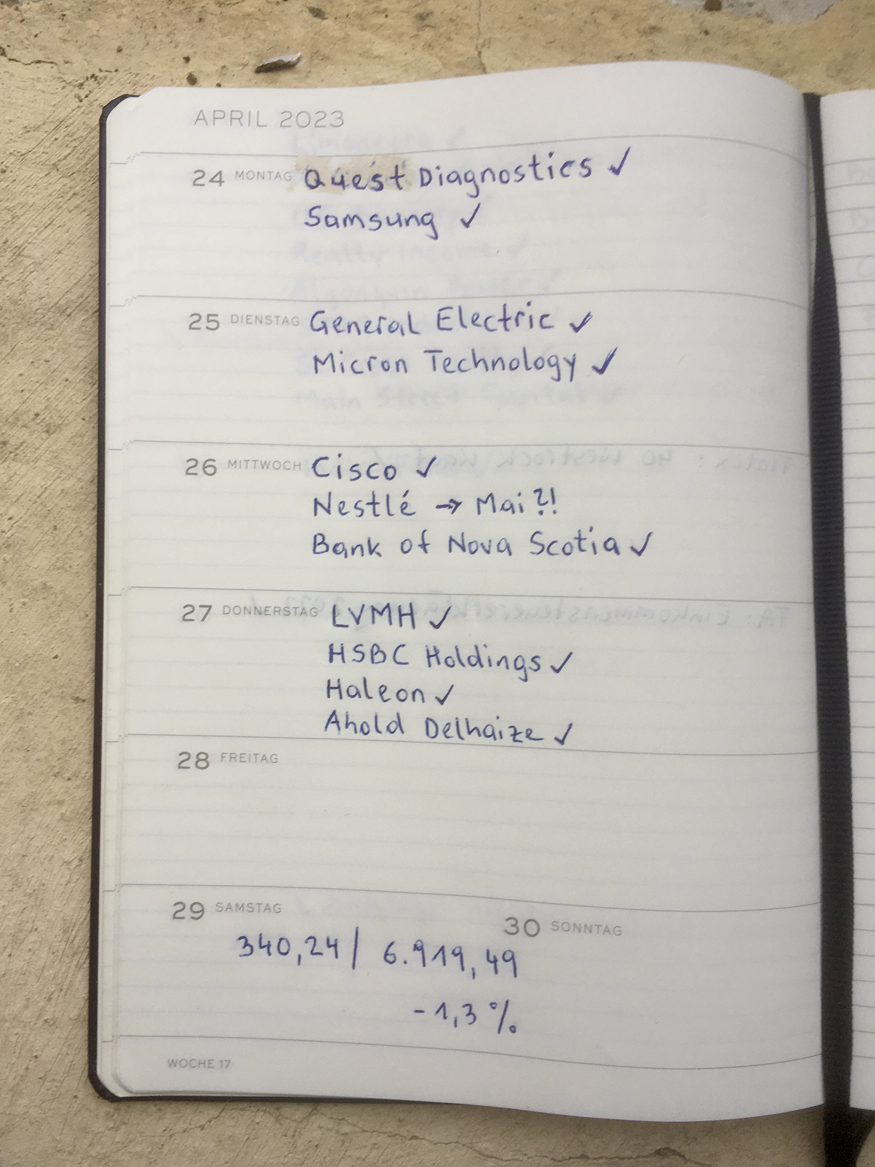 Ein Rückblick in den gut gefüllten Forecast für April 2023 (Nestlé & Goldman Sachs BDC sind in Mai verschoben):