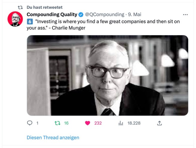 Es passt auch mit dem Spruch von Charlie Munger den ich in Twitter gefunden habe – diesmal nicht als Link sondern als Bild: