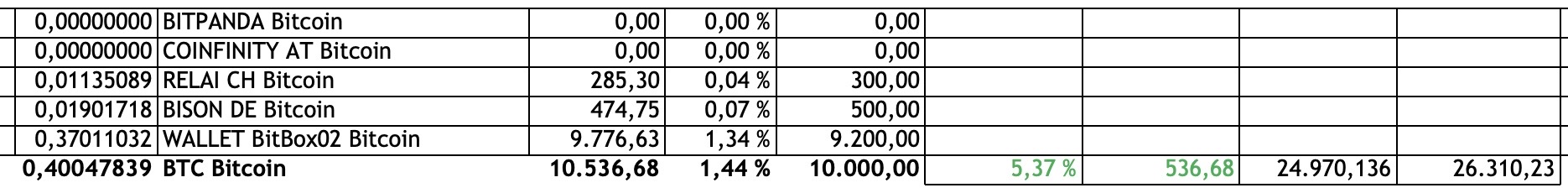 Bei Bitcoin habe ich nun meine nächste Investmentmarke erreicht – gleichzeitig beträgt die Position nun 0,4 BTC…