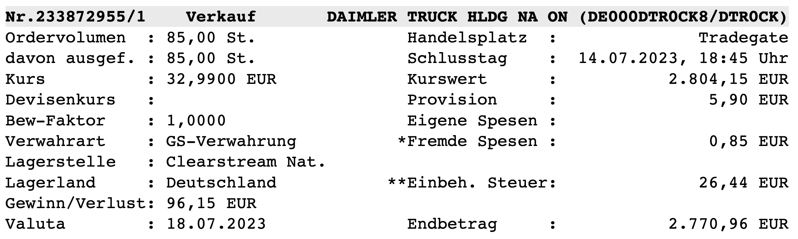 Auf meiner Verkaufsliste stand noch Daimler Truck die aus dem Spin Off von Mercedes Benz im Depot lag. Kursziel war zwar 33 EUR und ich habe dann mit 32,99 EUR doch noch am Freitag Abend verkauft.