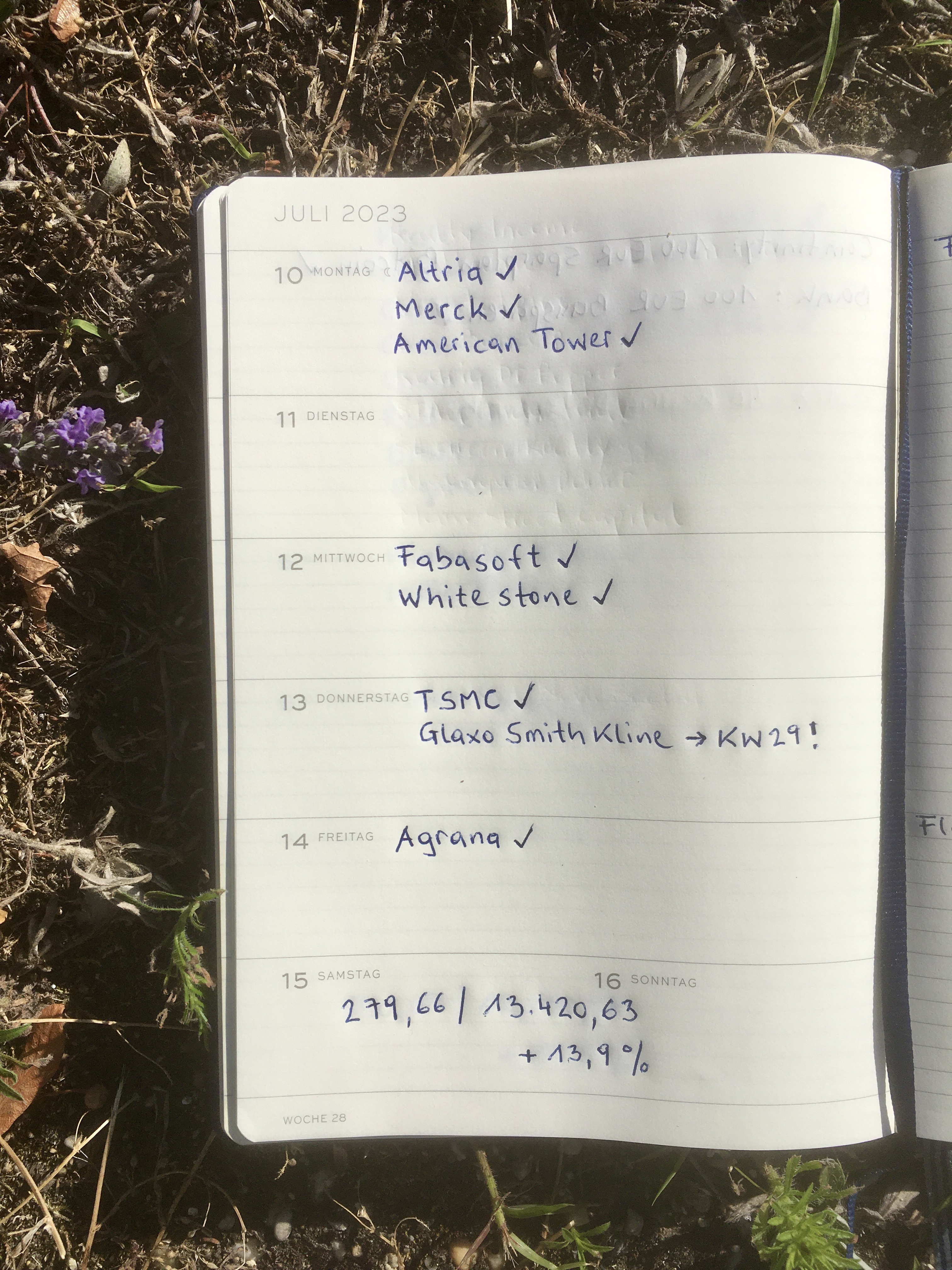 Leider fehlt der Zahlungseingang von GSK (GlaxoSmithKline) die ich in die Folgewoche buchen muss. Der Lavendel steht in voller Blüte und die Felder mit Sonnenblumen strahlen auch schon 🌻