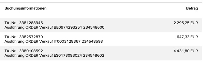 Mit den 7 TEUR ist nun auch der Margin Kredit auf 33 TEUR gekürzt. Im zweite Schritt werde ich wohl US-Unternehmen aussuchen die quartalsweise ausschütten. Aber zuerst die 3 durchgeführten Verkäufe: