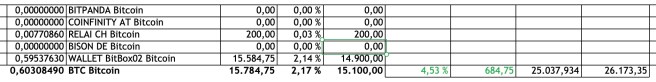 Damit ist mein Investment auf 0,6 Bitcoin gestiegen. Bei den aktuellen Kursen ist das 2,2% Gewicht mit dem Ziel > 1 BTC. Monatlicher Sparplan von 100 EUR läuft unverändert weiter.