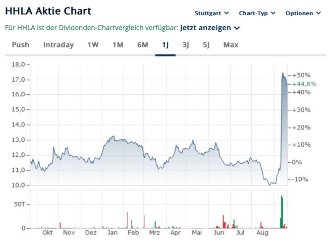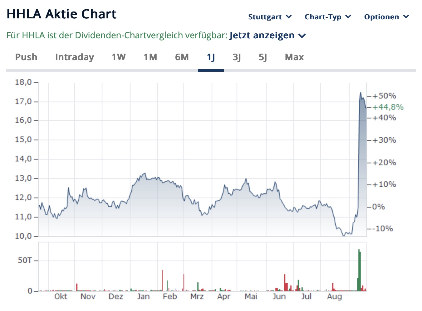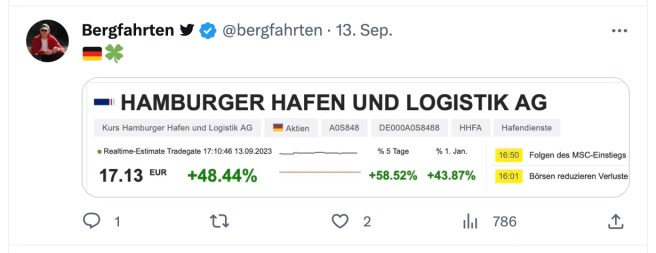 Am 13.9. wurde von MSC ein Angebot für den Einstieg in den Hamburger Hafen Logistik übermittelt. Daraus resultierte ein Kurssprung von rd. +50%.