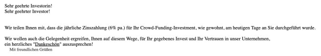 Einige Crowd Investments laufen im direkten Kontakt mit den Unternehmen ab. Diese Woche hatte ich Spörk Antriebstechnik mit Zinsen geplant. Am Montag kam ein nettes Infomail und am Dienstag war die Überweisung am Girokonto.