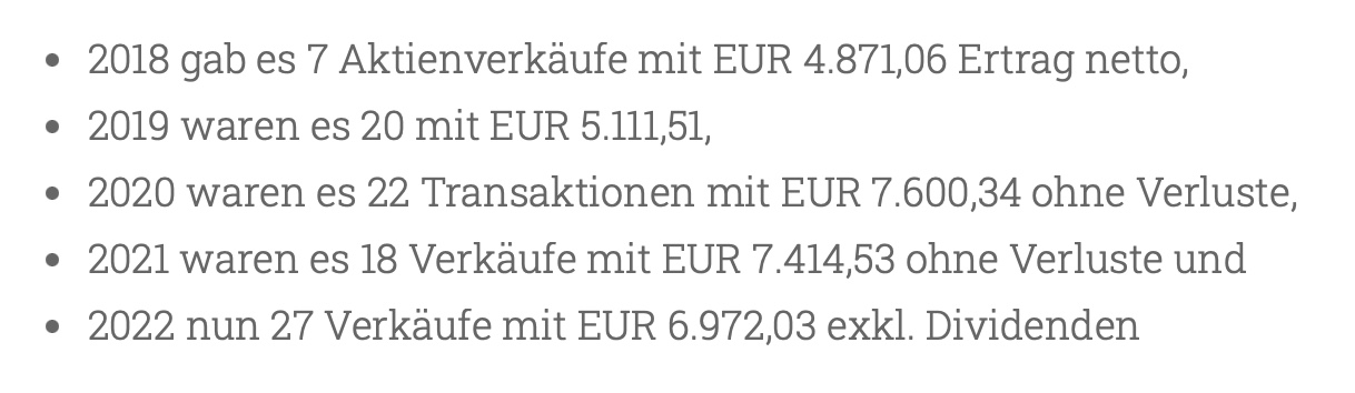 Zu den Verkäufen – zum letzten Jahresabschluss habe ich festgestellt dass ich zu viele Transaktionen durchgeführt hatte. Somit passt es auch heuer nach 11 Verkäufen das abzuschließen. Das sind ca. ein Verkauf in 2023 pro Monat und das kann ich für 2024 auch noch etwas reduzieren.