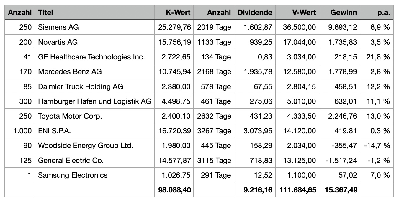 Zuerst die Verlierer: Woodside Energy war ein Spin Off deren Kaufwert ich nicht beeinflussen konnte für General Electric sah ich nach 3.115 Tagen oder 8,5 Jahren wenig Potential für weitere Anstiege. Den GE Healthcare Spin Off hatte ich aus dem Unternehmen mit Gewinn verkauft.