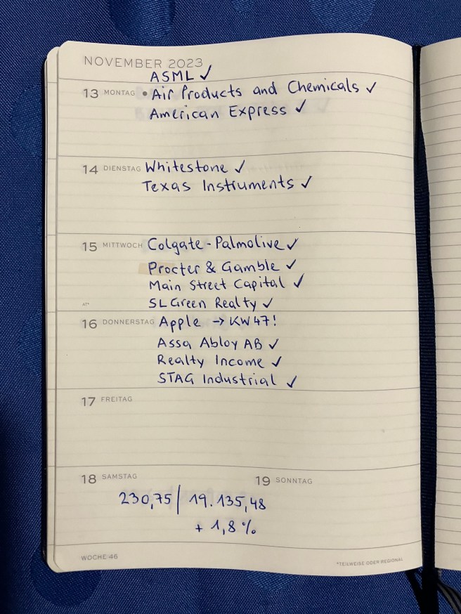 Mit Hilfe der Dividenden von Procter & Gamble habe ich diese Woche die 19 TEUR netto in 2023 überschritten. Im Dezember sollten meine Nachkäufe von Johnson & Johnson, 3M und Coca-Cola positiv wirken und es wird ein guter Jahresabschluss werden 🥂