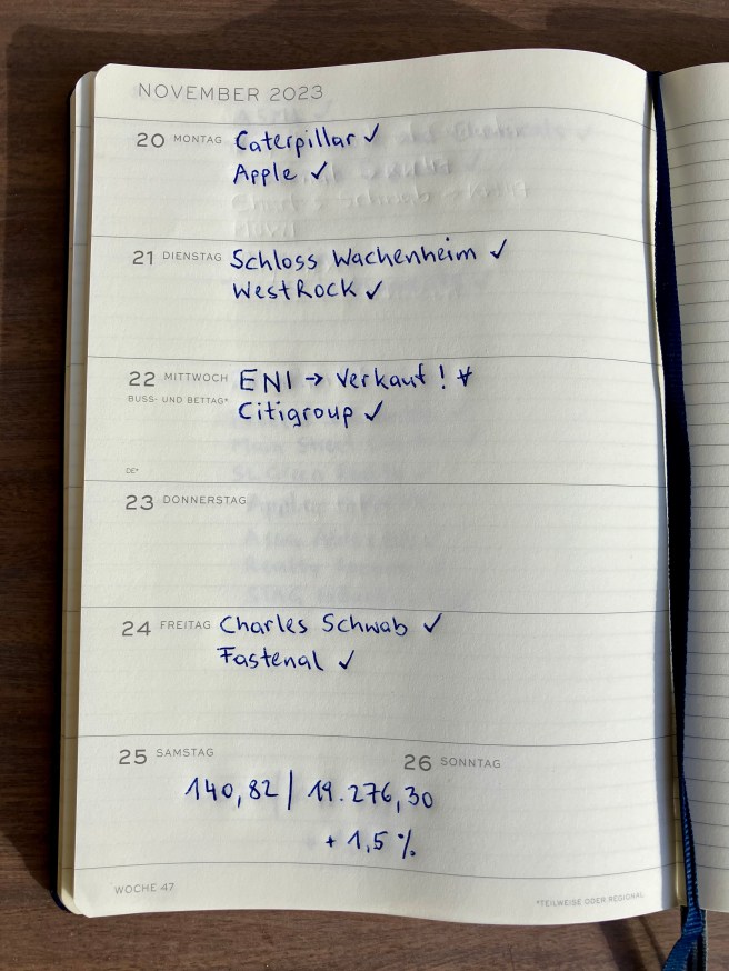 Ich mag es ruhiger und jetzt kommt die vorweihnachtliche Zeit. Das Verrechnungskonto ist wieder auf Null saldiert und der November Abschluss kann nächste Wochen kommen. Mit zwei Käufen in ETFs und Blackstone aus der Watchliste habe ich rd. die Hälfte investiert und die zweite Hälfte wanderte auf das Girokonto für Sparpläne, Gasrechnung, Bitcoin Heizung, Weihnachten und Jahreswechsel 🎄
