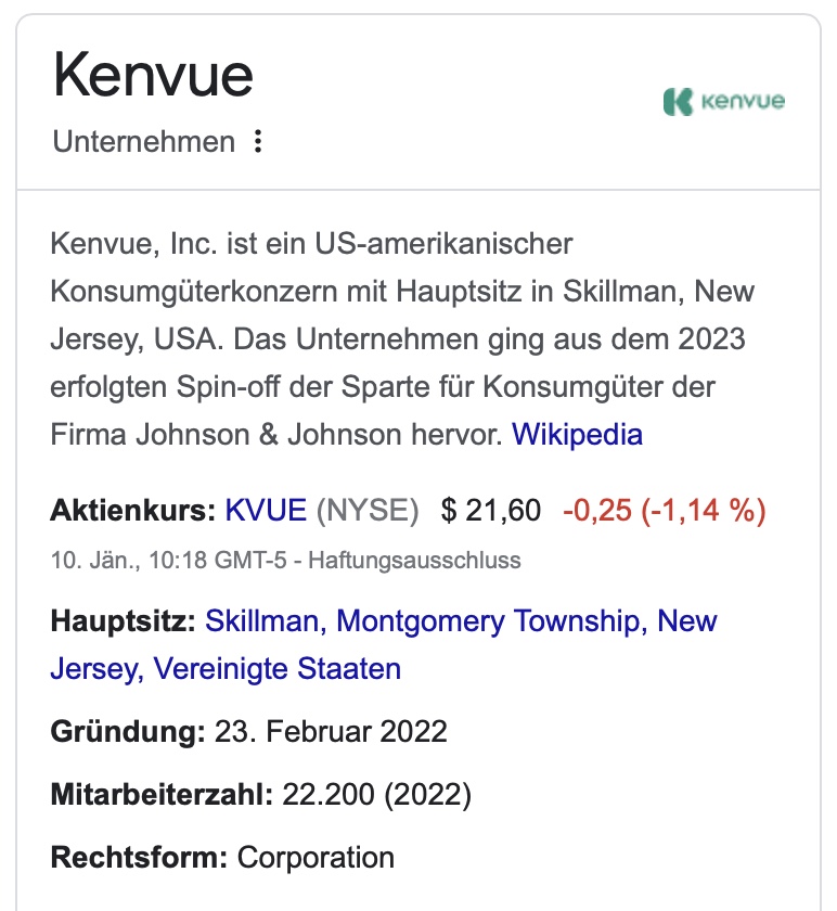 Wer sich mit Johnson & Johnson beschäftigt der kennt diese Firma. Es ist der Spin Off vom letzten Jahr und ich wollte keine J&J Aktien in Kenvue tauschen. Der Splitt ist wie GlaxoSmithKline und Haleon nun bei J&J und Kenvue erfolgt – die bekannten Konsumartikel wurden als eigene Unternehmen ausgegrenzt. Diese passen wie P&G oder Unilever in mein Beuteschema und wanderten daher in meine Watch List…