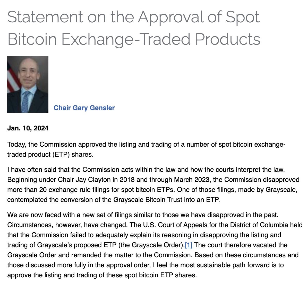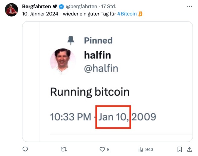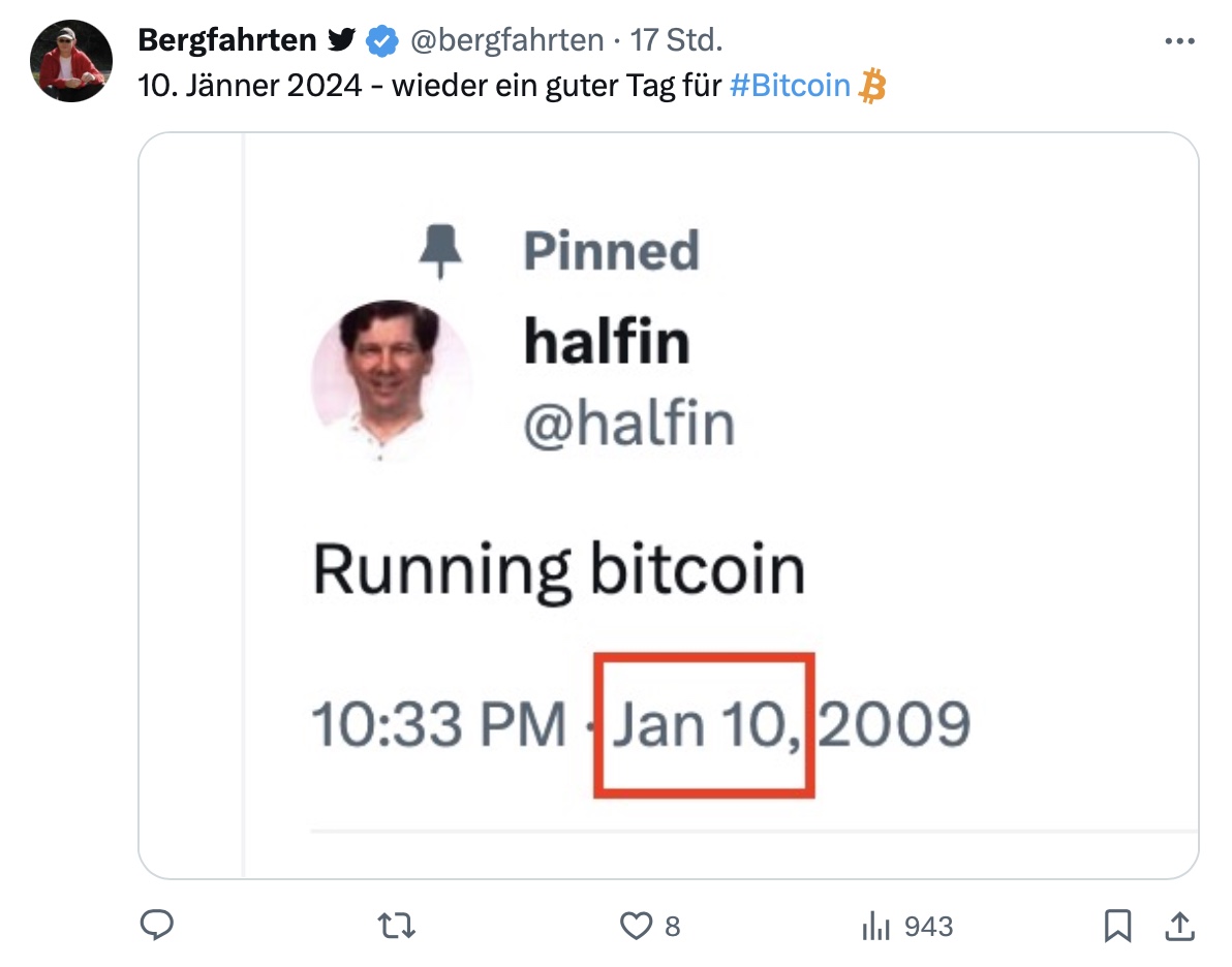 Die Amerikaner lieben traditionelle Termine. Daher war es fast absehbar dass die Zulassung der Bitcoin ETF am 10. Jänner erfolgen wird. Hal Finney hat seinen bekannten Tweet eben am 10. Jan 2009 abgesetzt…