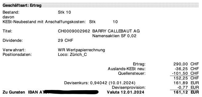 das ist die Abrechnung der Dividende durch die Easybank. Dafür bekomme ich 58 CHF retour. Daher warte ich noch auf Nestlé und Roche. Für alle Drei Dividenden stelle ich dann einen Antrag auf 20% Rückerstattung für die Brutto Dividende. Der Betrag kommt dann in CHF auf mein Girokonto. Leider habe ich kein CHF-Konto. Daher wird die Easybank dann wieder ein paar EUR an Devisenprovision kassieren. Wie es andere Banken oder Broker in Österreich handhaben kann ich dir nicht sagen, da hilft nur ausprobieren!