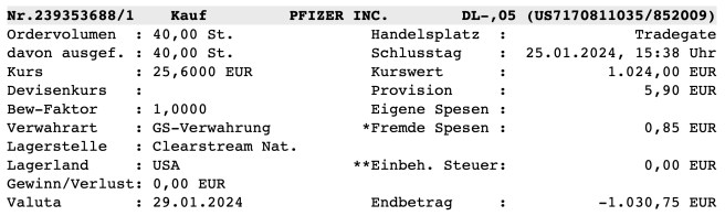 Mein pragmatischer Ansatz für den Kauf – Branche für mich als Beute 1A und aktuell mit 5% Dividendenrendite eine Gelegenheit bis perfekt. Mr. Market könnte das Wahljahr in der USA bemängeln dass Politiker vor der Stimmabgabe die Pharmaindustrie diskreditieren könnte. Ich denke halt etwas länger als bis zur nächsten Wahl. Gestern war aber bei Pfizer auch der Ex-Tag, d.h. Kursabschlag und somit muss ich bis Juni auf die erste Ausschüttung von 0,42 USD je Aktie warten.