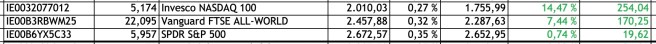Diese drei Depotpositionen kommen eben aus dem globalen Aktien-Sparschwein (Vanguard FTSE All-World), der Tech-Erweiterung (Invesco Nasdaq 100) und dem „don’t bet against America“ von Warren Buffett (SPDR S&P 500).