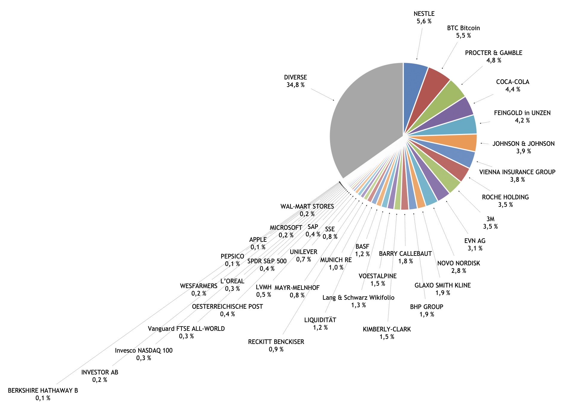 Eines meiner Prinzipien war mein Risikoprofil mit 5% Gewichtung für einzelne Positionen zu investieren. Wer meine Top Positionen wie Nestlé, Procter & Gamble und eben Gold & Bitcoin sieht sind dabei meine Grenzen erreicht. Auf der anderen Seite der Münze liegt eine under Performance weil ich Tech vernachlässigt habe.