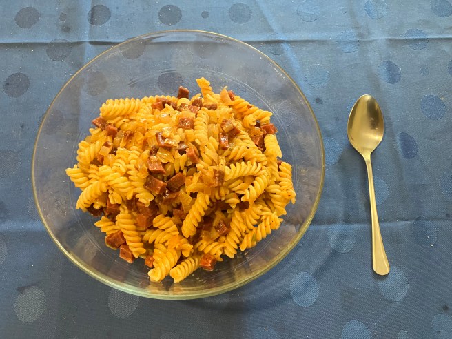 Dazu vertrage ich dann ein paar Kalorien – pannonische Wurscht-Nudeln mit viel Knoblauch & Zwiebel 😅