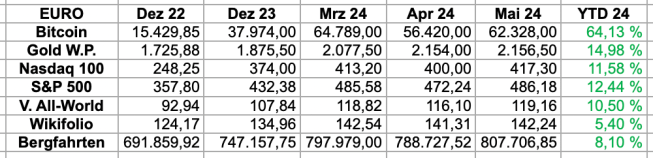 Willkommen im Bergfahrten Blog – 5 Monate von 2024 sind bereits vorbei. Es war ein wechselhaftes Monat. Die erste Monatshälfte steigende Kurse, Schwäche im letzten Drittel aber ein starker letzter Börsentag. Die genauen Daten erfasse ich nur für den Monatsabschluss – aber die Depotschwankungen werden stärker.