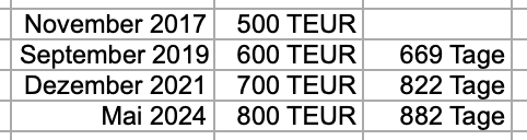 An die Volatilität der Märkte gewöhnt man sich mit der Zeit. Apropos Zeit, zuletzt wurde wieder oft in der „Social Media Welt“ über die ersten, schweren und wichtigen 100 TEUR diskutiert. Deshalb interessierte mich dann auch der Faktor Zeit – wie lange dauert es bis der Buchwert von einem zum nächsten Meilenstein steigt…