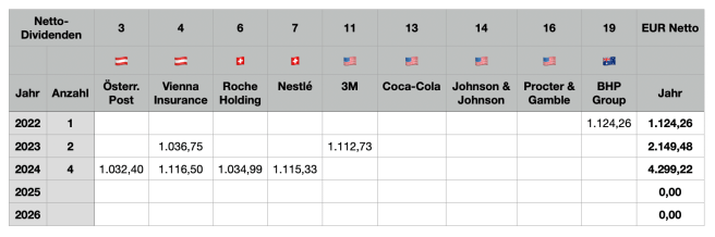 2024 war bereits erfolgreich – mein Ziel der 1 TEUR Dividenden hat sich bereits auf 4 Unternehmen verdoppelt. Coca-Cola sollte es zu Weihnachten auch schaffen – noch 3 Dividenden für Juli, Oktober & Dezember und Coca-Cola hatte ich nachgekauft. 2025 könnte dann Johnson & Johnson knapp dazu kommen, je nach Dividendenerhöhung und USD Kursentwicklung…
