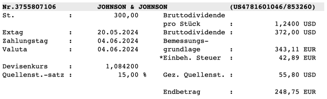 Die größte Position war bereits angesprochen und Johnson & Johnson. Leider fehlte auf 250 EUR netto pro Quartal ein wenig 🙃