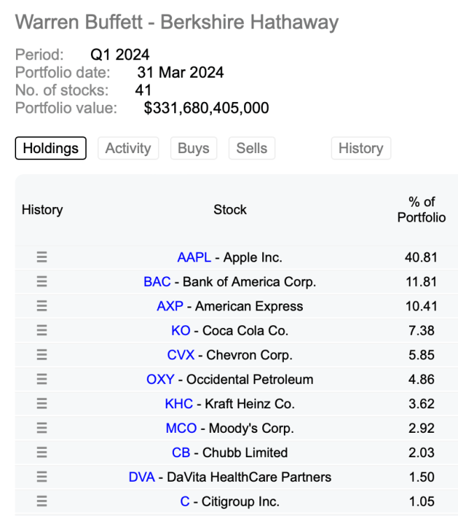 bei dem 40% Anteil von Apple bei Berkshire sollte man beachten, das dieser Anteil nur für die börsennotierten Beteiligungen gilt. berkshire besitzt jedoch sehr viel nicht börsennotierte Unternehmen, vor allem Versicherungen wie Gesko. D.h der Anteil von Apple im Gesamtportfolio dürfte deutlich geringer sein.