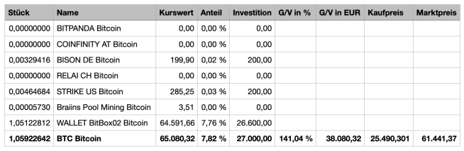 Meine Auswertung von Ende Juli 2024 stehe ich jetzt bei einem Kaufpreis von 25,5 TEUR bzw. ein Plus von 141%. Aktuell kaufe ich monatlich noch 100 EUR über Coinfinity nach.