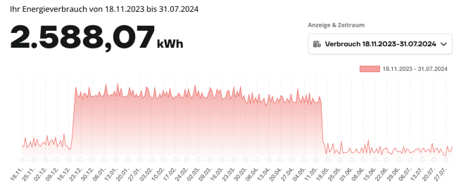 Winter 2023/2024 habe ich nun einen Bitcoin Heater von 21energy verwendet womit eben der Stromverbrauch gestiegen ist – Heizperiode Mitte Dezember bis Mitte Mai: