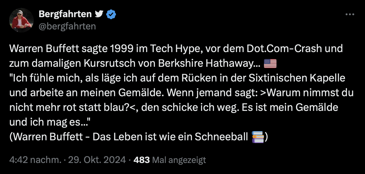 Danach kam der Dot.com-Crash und er hatte langfristig recht. Mein Fazit – für das persönliche Portfolio ist jeder selbst verantwortlich und die „Tipp’s von Besserwissern“ sind doch nur Noise den man aushalten muss.