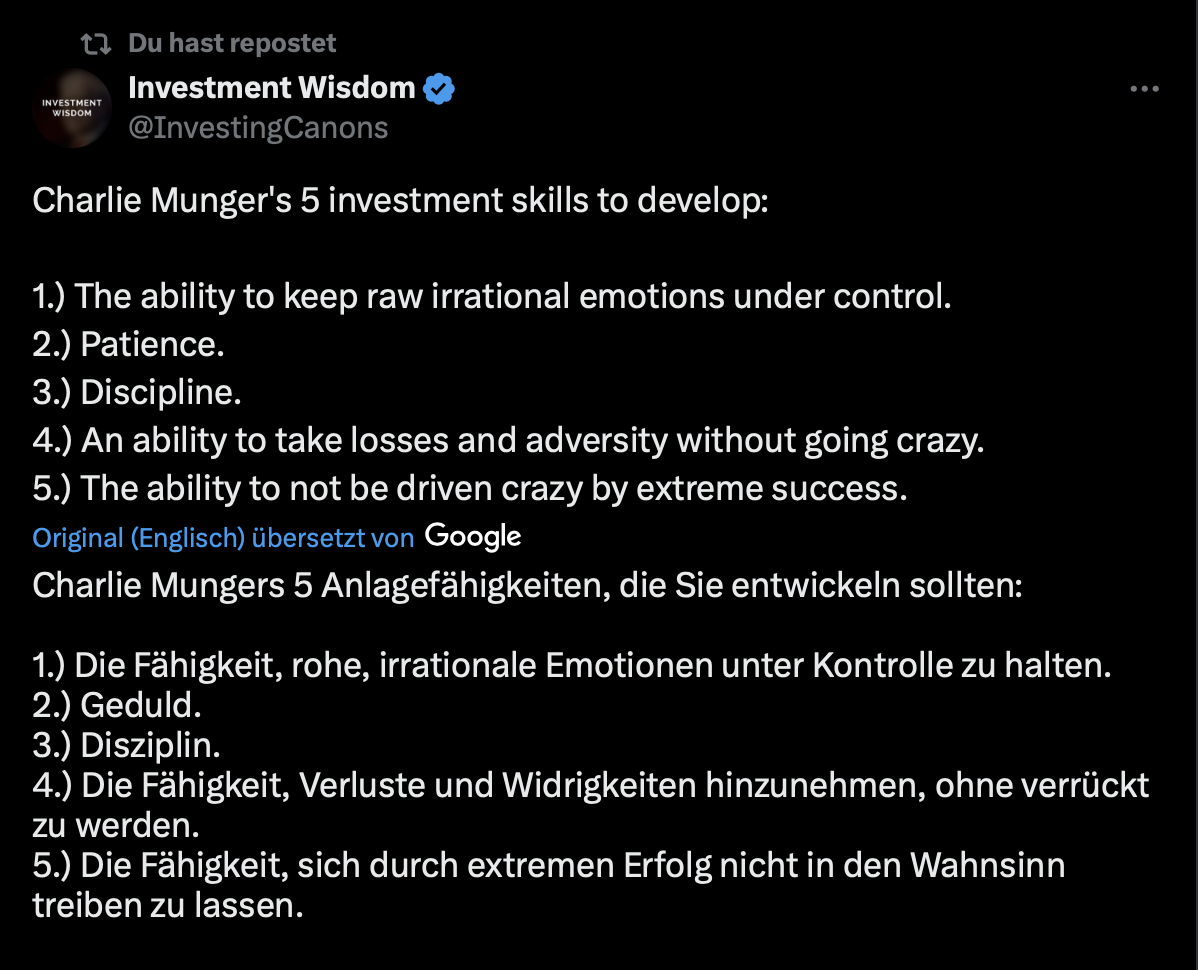 Wie schnell die Zeit vergeht. Ich kann es nicht glauben, dass Charlie Munger fast ein Jahr tot ist. Die genannten Weisheiten gefallen mir. Gerade die Disziplin und die Geduld. Es freut mich sehr, dass du fast dein Dividendenziel erreicht hast. Liebe Grüße aus Dortmund.