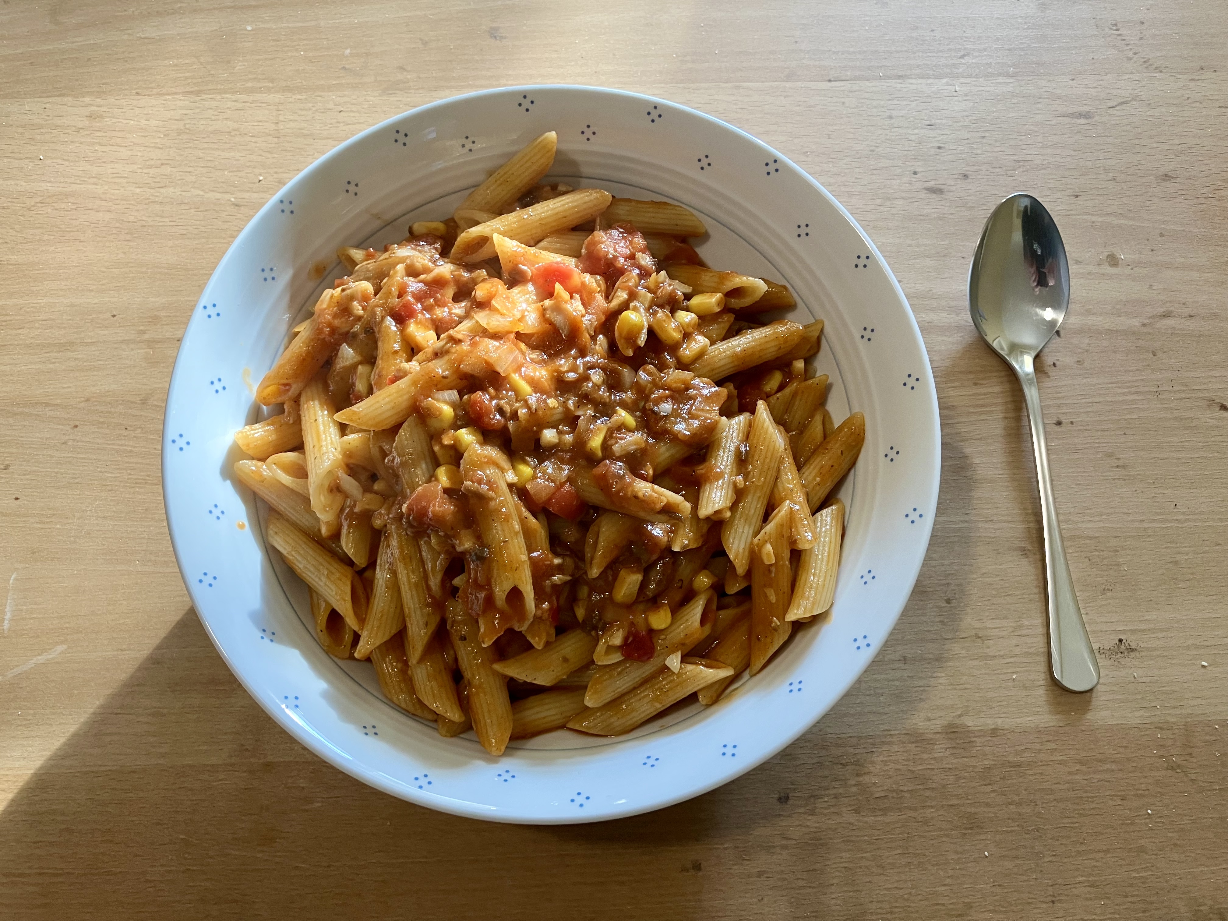 Der Bergfahrten Koch hat sich am Wochenende einmal ein Fisch-Mais-Sugo mit Penne gegönnt 🐟