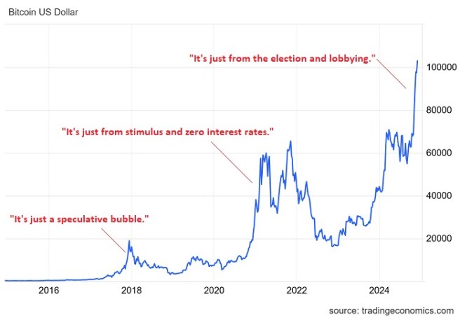 Trotzdem war der erstmalige Sprung eines 5 aus 6stelligen Bitcoin Kurses ein Spektakel. Es gibt einige seriöse Gründe und manche reduzieren es auf Politik. Vorher wurde es auf die ETF reduziert. Beides war in 2024 sicher wichtig.