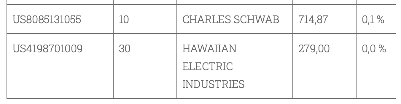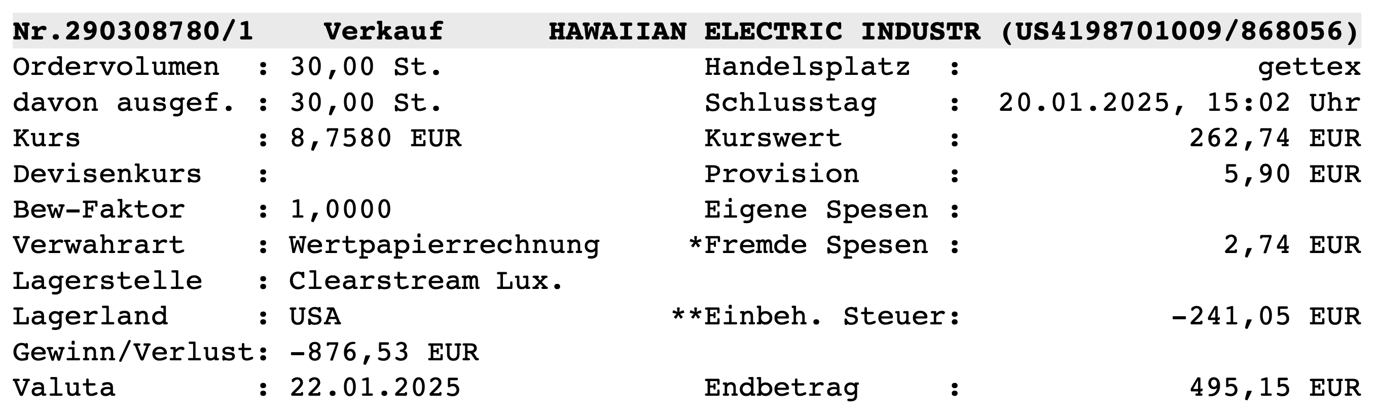 Hawaiian Electric war eine Depotleiche. Ursprünglich ein Versorger aus Hawai die leider dem tragischen Feuer zum Opfer gefallen ist. Verluste ca. -70% und ich werde diese Position nicht mehr aufbauen.