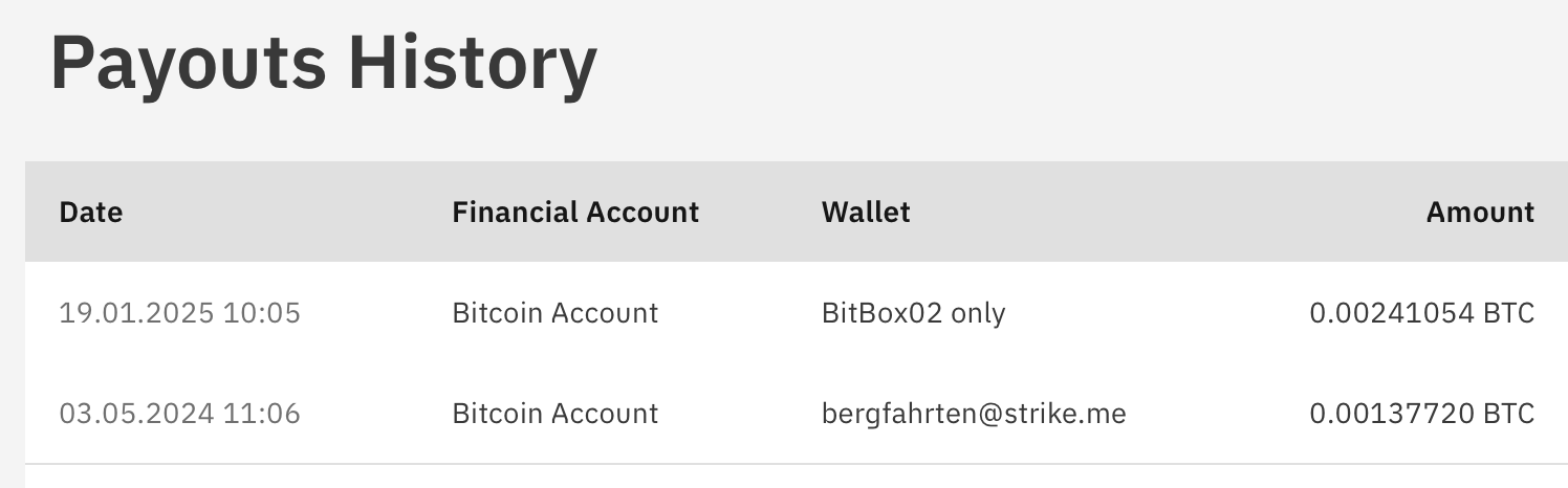 Das zweite mal gab es Satoshi für das Mining vom Braiins Pool. Im ersten Anlauf ließ ich mir diese auf mein Strike Konto auszahlen und diesmal direkt auf die BitBox02 Wallet. Beides hat einwandfrei funktioniert und sind angekommen…