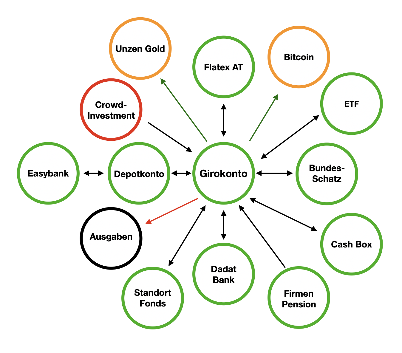 - Zusätzlich ist Bitcoin als Zukunft und Anker seit 2021 dazugekommen. ETF und der Standortfonds als passive Investments. Die Firmenpension seit4. Quartal 2024 als Einnahmequelle.