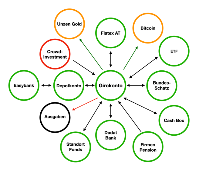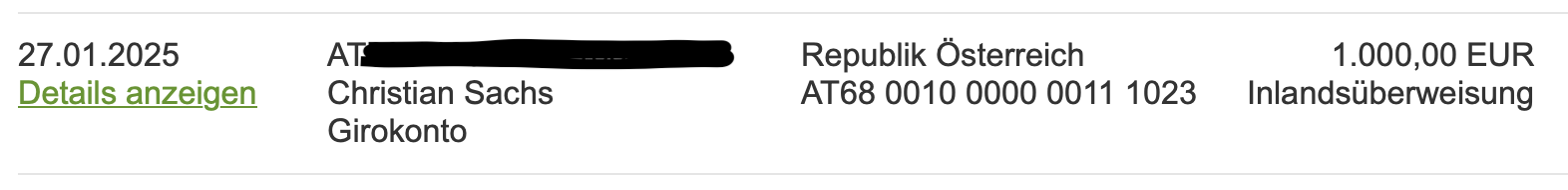 Die Verbindung und Transfers zwischen Girokonto inkl. Notgroschen und Bundesschatz als Liquidität sind seit letzten Dezember verstärkt genutzt worden. Gestern kam eine kleine Teilrückzahlung für ein Crowd Investment und ich habe wieder 1 TEUR transferiert: