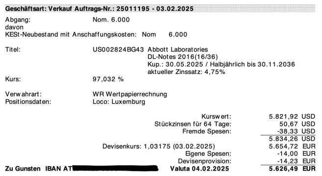 Die Zinsen für 64 Tage werde ich als Einkommen in der Kalenderwoche 06 / 2025 einbuchen. Ein Mini Verlust bringt einen steuerlichen Verlustausgleich von 13,50 EUR.