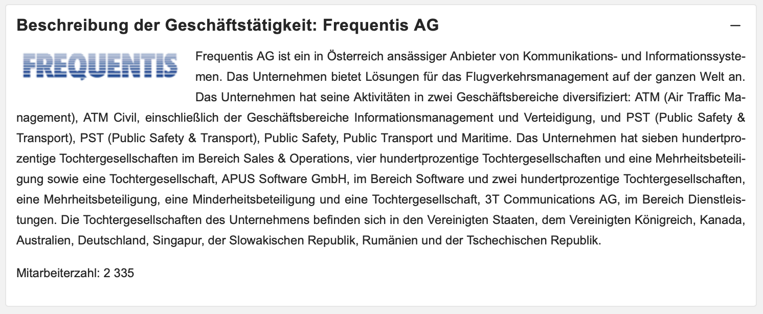 Sicherheit wäre ein gutes Investment. Beim Aufräumen 2024 habe ich einige kleine AT-Positionen verkauft. Frequentis ist Marktführer für Sprachkommunikation (VCS) im Bereich Flugverkehrsmanagement (ATM). Nach einer Info von 2021 werden weltweit 500 Kunden in 140 Länder betreut.