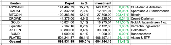 Oekostrom existiert bereits 25 Jahre, persönlich bin ich von dem Versorger sowohl Kunde als Aktionär mit Skin in the Game. Ein expandierendes Small Cap Unternehmen mit knapp 100 Mitarbeiter ist riskanter als die ETF aber 31 TEUR von 871 TEUR sind „nur 3,6%“ in der Gesamtgewichtung. Meine Risikogrenze wären 5% gewesen 😎