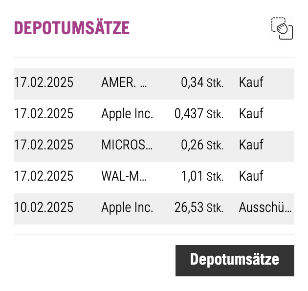 Der Februar ist ja wirklich mit nur 4 Wochen ein kurzer Monat. Wegen Wochenende wurden die Sparpläne statt am 15. nun eben am Montag 17.02. durchgeführt. Ein Blick in die letzten DADAT Umsätze…