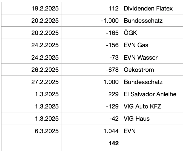 Mit einer erwarteten und hohen Abrechnung von Oekostrom und den Bundesschätzen musste ich mir diesmal die gröberen zukünftigen Cash Bewegungen zusammenschreiben, auch um die Übersicht zu behalten. Die nächsten 2 Wochen für den Februar Abschluss und den März Beginn…
