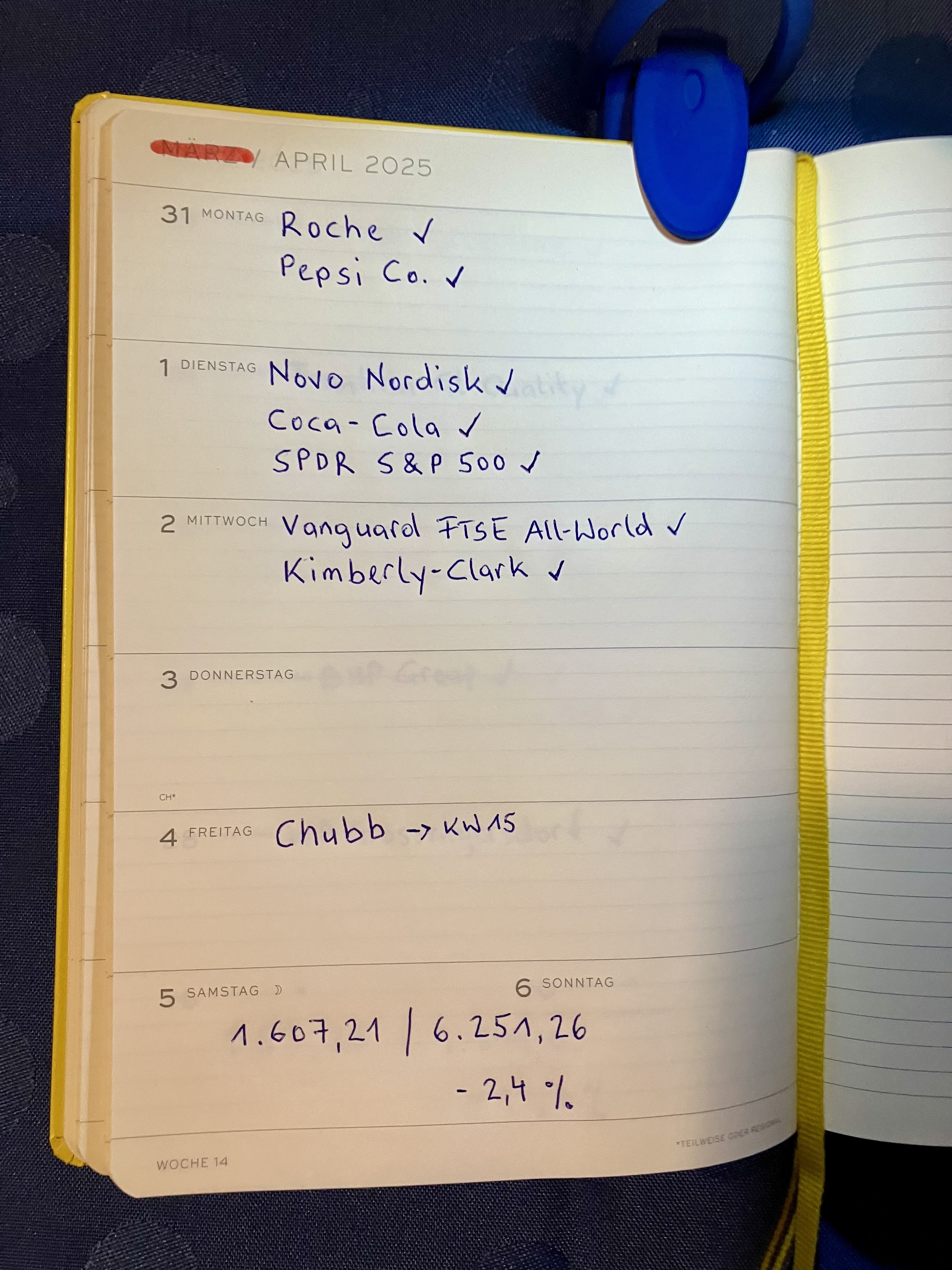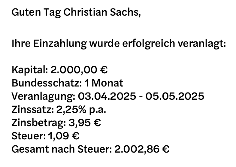 plus die Dividenden Einkommen >1 TEUR in der Kalenderwoche 14 werden diesmal nur für die geplanten Sparpläne und 2 TEUR für ein Monat Bundesschatz geparkt.