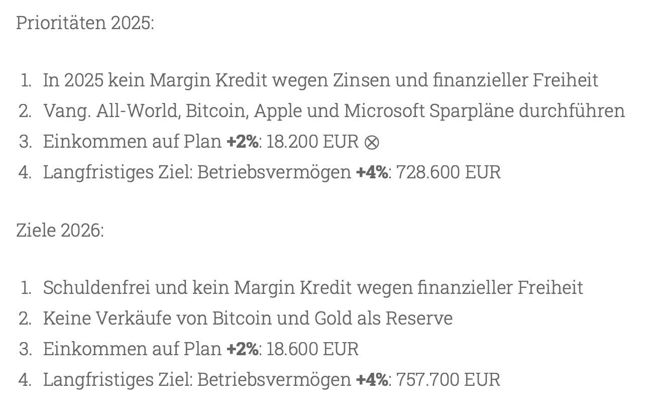 Wichtig in 2025 und auch für die nächsten Jahre ist mir – ich bleibe auf meinem Kurs auf Aktien (Einzelinvestment & ETFs), Bitcoin, Gold und schuldenfrei 😴