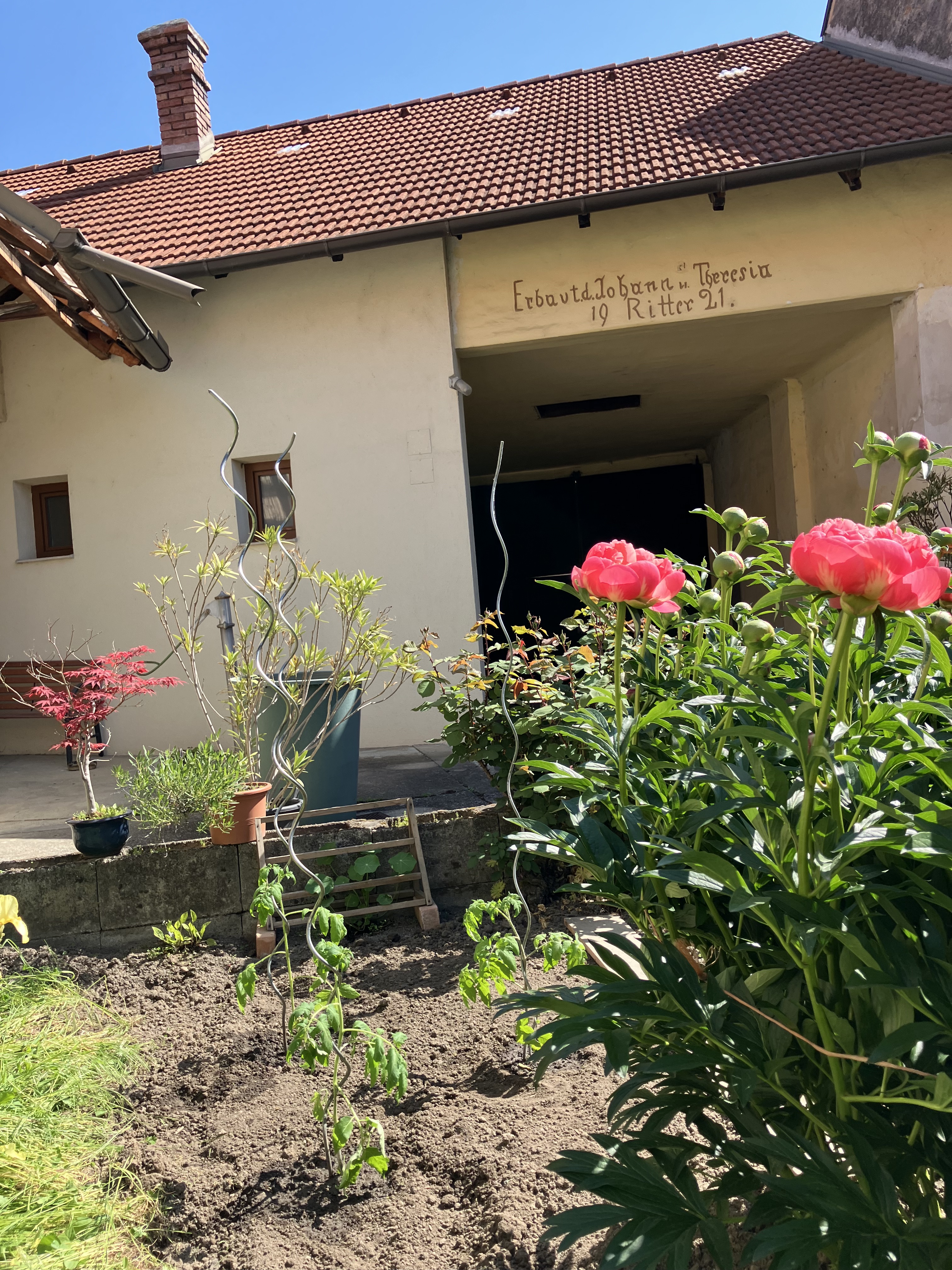 Zuvor hatte ich im Garten 3 Paradeiser, für meine deutschen Leser Tomaten gepflanzt. Der Himmel ist strahlend Blau, die Pfingstrosen beginnen zu blühen und mein Bauernhof auf 1921 und ich freuen uns über doch 2 bewohnte Schwalbennester 😎