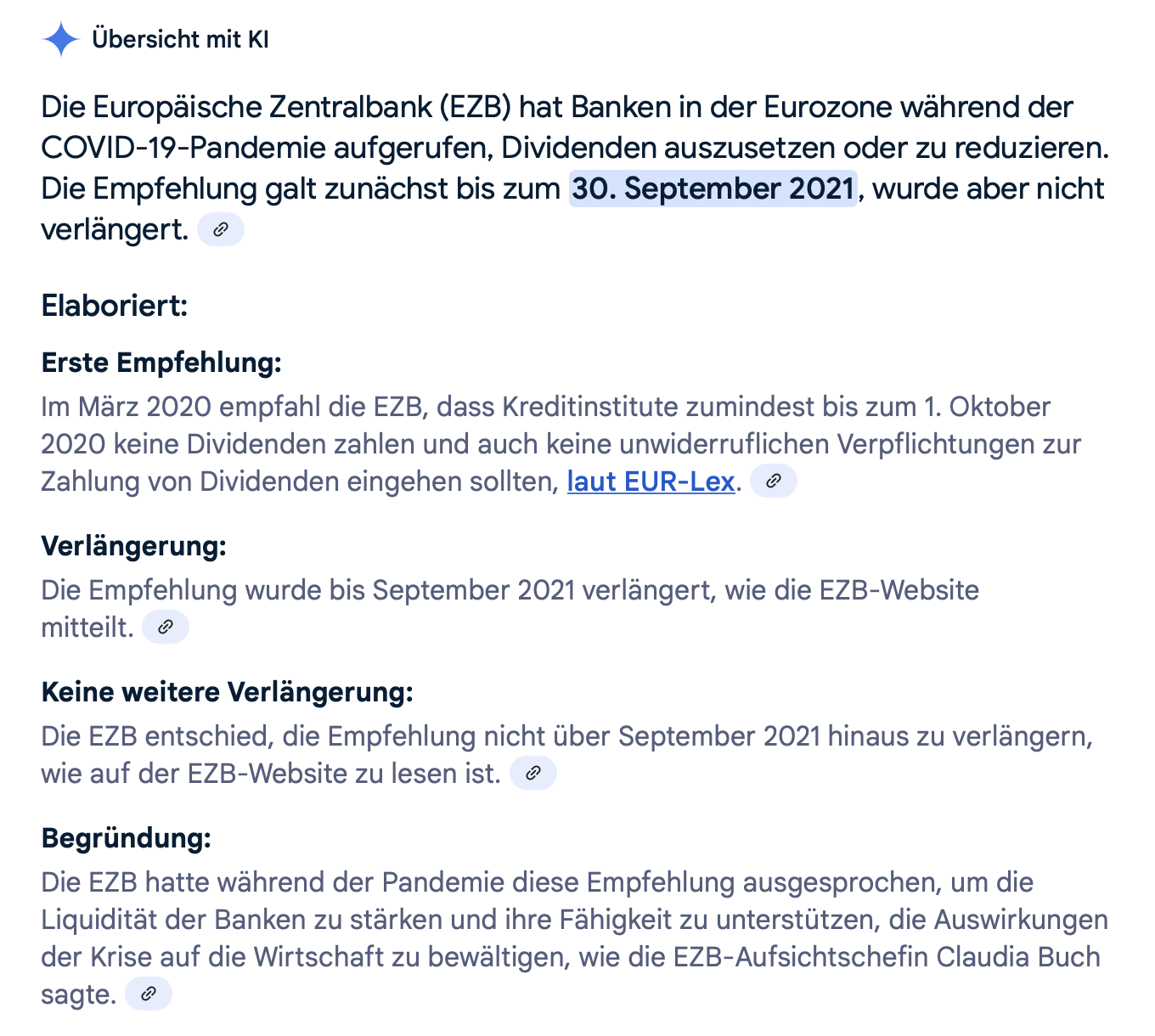 Rückblick: Februar 2020 beginnt die Corona-Krise. Die EZB fürchtet März um die Liquidität ihrer Banken und empfehlen den lokalen Geldinstituten die Streichung der Dividenden. Quercheck über die KI…