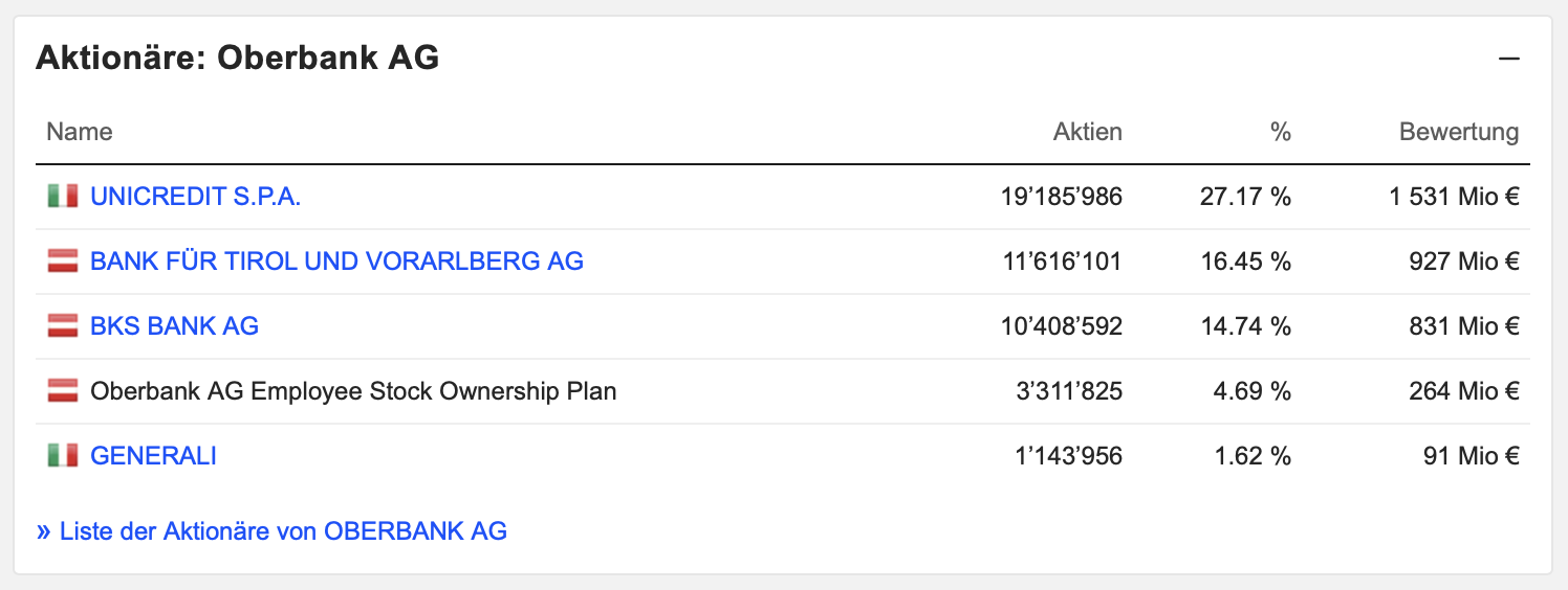 Der größte Aktionär ist aktuell die Unicredit 🇮🇹 wohl auch noch von der Übernahme der Bank Austria. Auf der Positiven Seite stehen aber fast 5% Mitarbeiter Aktionäre die für „ihr Unternehmen“ mitarbeiten…