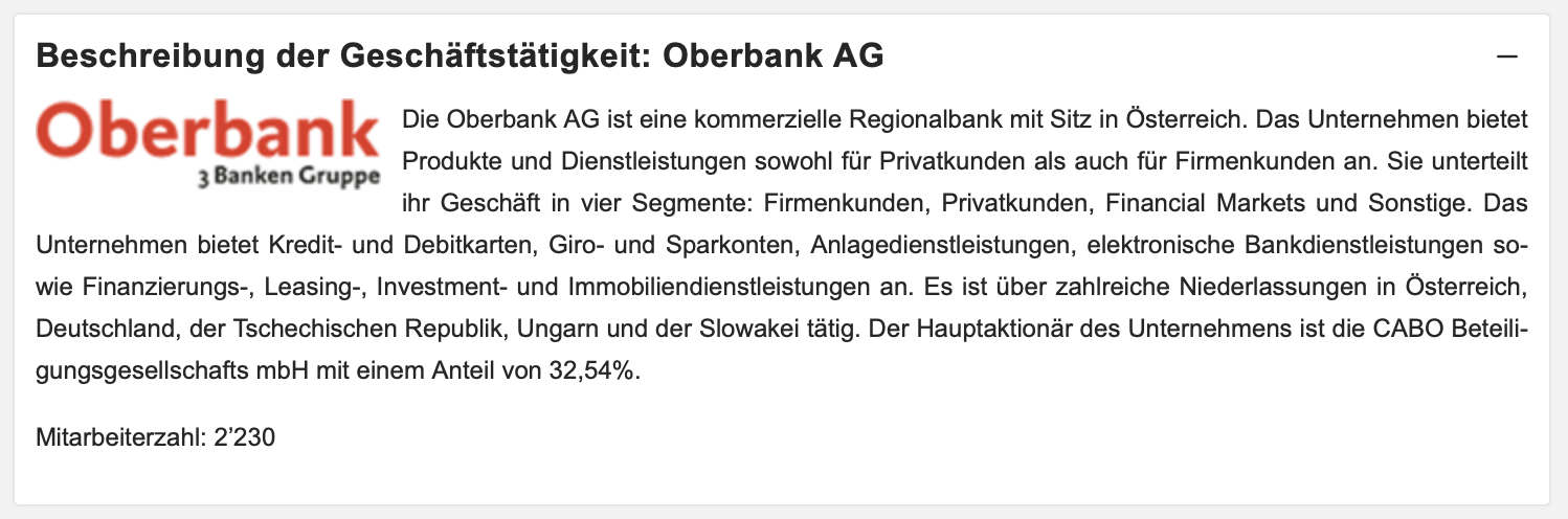 Achtung, das ist wie immer keine Empfehlung. Für mich ist es eine lokale, aber feine Bank in Österreich mit wenig Aktienhandel – es ist ähnlich wie Frequentis oder Ökostrom eher eine Nische in der Nische – aber für mein zunehmendes Alter eine gute Wahl. Niederlassungen nur in der Nachbarschaft existieren…