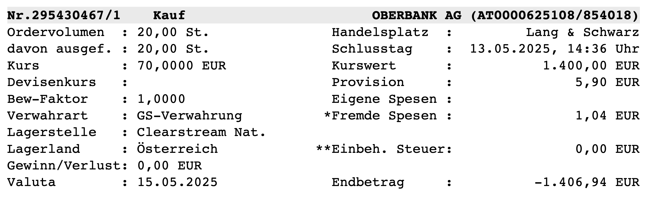 Gekauft habe ich für mein Flatex Depot (Keine Depotgebühr und keine Dividendenspesen für AT & DE) aber bei Lang & Schwarz. Der Spread war richtig schlimm 66 vs. 70 EUR aber um 20 Cent billiger als an der Wiener Börse.