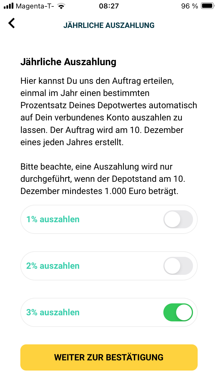 Mittlerweile gab es bei der Sunrise APP ein interessantes Update – einen jährlichen fixen Verkauf im Dezember. Die Dividenden bleiben somit im Kurs aber man kann wahlweise die Auszahlung von 1, 2 oder 3 Prozent wählen.