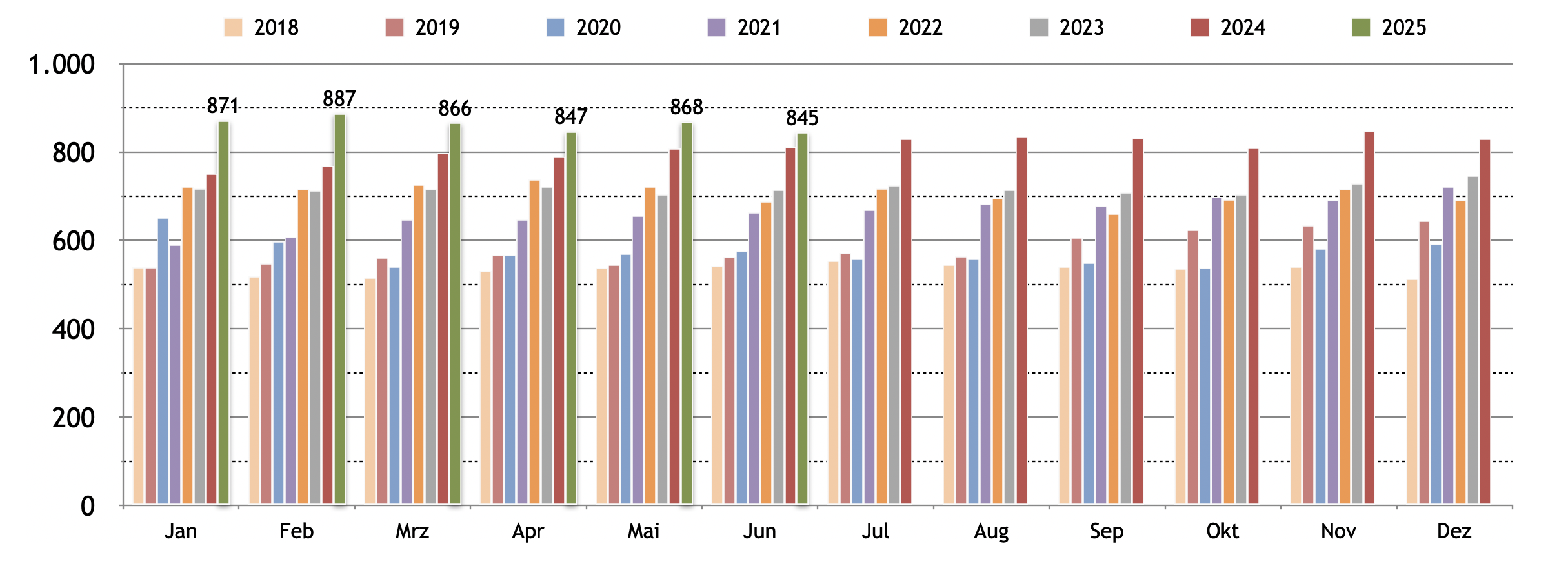 Das letzten ATH im Februar 2025 waren 887K und jetzt pendelt es sich um 850K ein 🥂